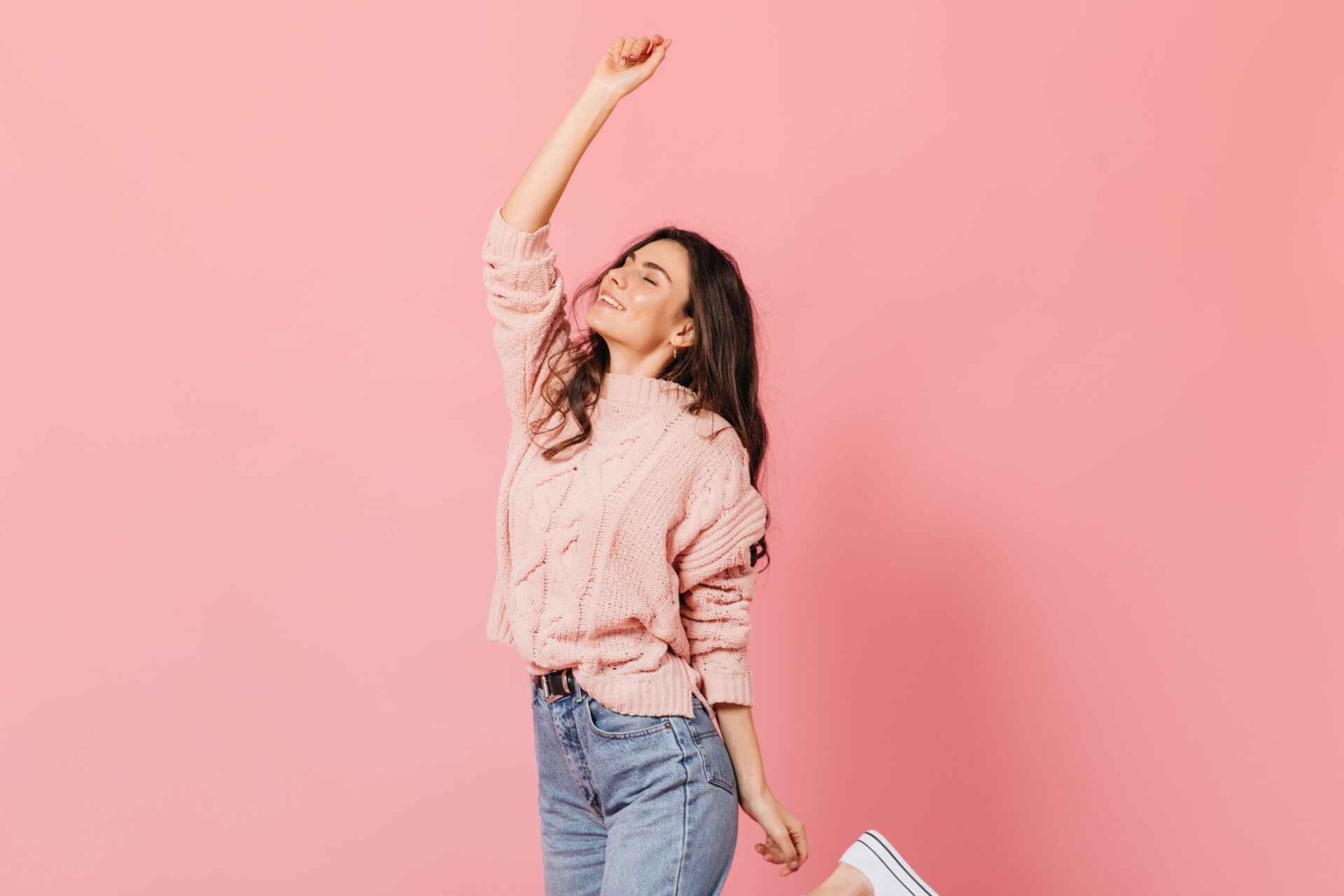 cheerful-brunette-girl-knitted-sweater-blue-jeans-raises-her-hand-up-smiles-pink-backgroundosnat2023-02-28T20:29:32+02:00